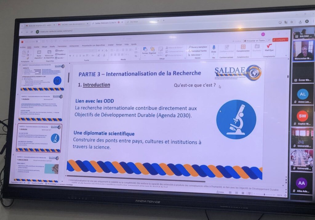 Du 28 Mai au 4 Juin 2025, dans le cadre du lot de travail 2 “Renforcement des stratégies d’internationalisation”, le projet SALDAE a organisé trois webinaires pour présenter les expériences européennes sur les stratégies d’internationalisation aux partenaires impliqués dans la définition des stratégies de coopération et des politiques d’ouverture à l’international, ainsi que dans le processus d’élaboration de ces stratégies et du plan d’actions pour leur mise en œuvre.